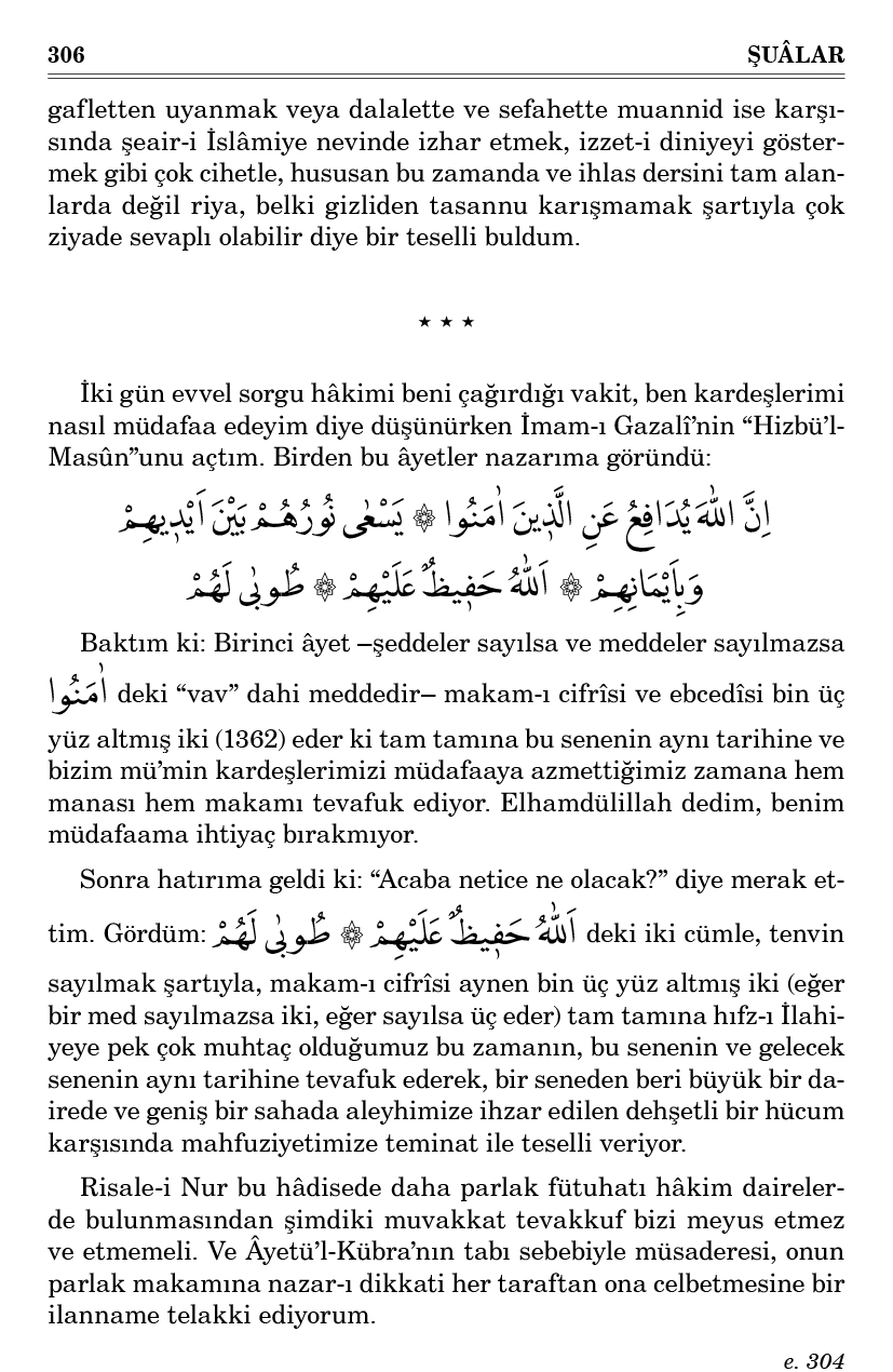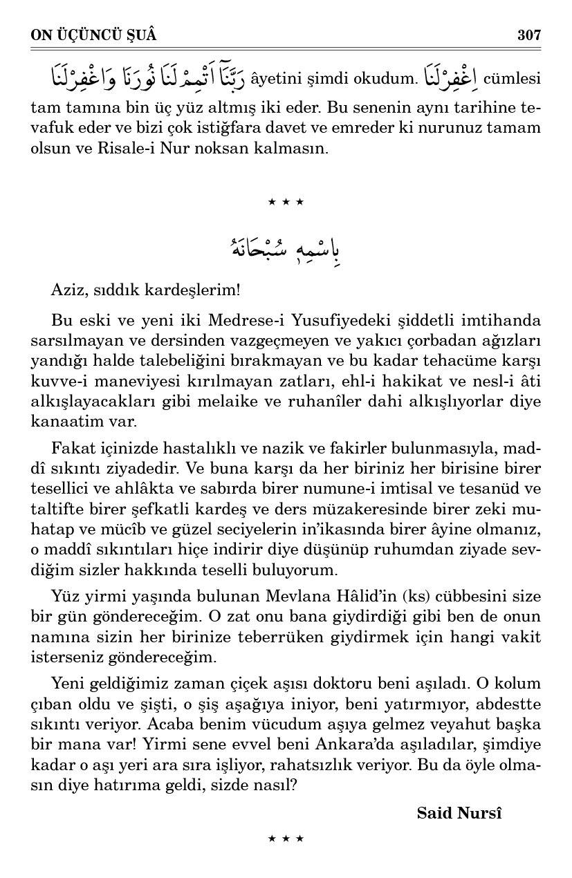 رَبَّنَٓا اَتْمِمْ لَنَا نُورَنَا وَاغْفِرْلَنَا âyetini şimdi okudum. اِغْفِرْلَنَا cümlesi tam tamına bin üç yüz altmış iki eder. Bu senenin aynı tarihine tevafuk eder ve bizi çok istiğfara davet ve emreder ki nurunuz tamam olsun ve Risale-i Nur noksan kalmasın.