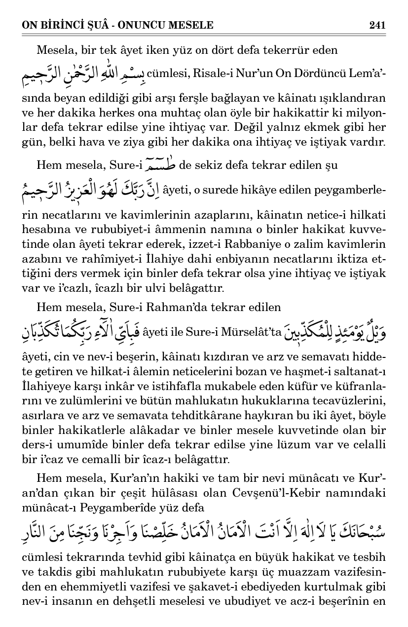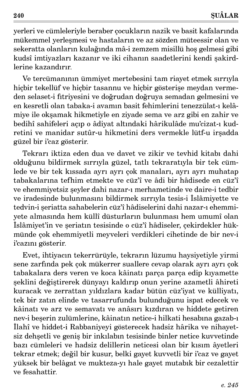 Evet, ihtiyacın tekerrürüyle, tekrarın lüzumu haysiyetiyle yirmi sene zarfında pek çok mükerrer suallere cevap olarak ayrı ayrı çok tabakalara ders veren ve koca kâinatı parça parça edip kıyamette şeklini değiştirerek dünyayı kaldırıp onun yerine azametli âhireti kuracak ve zerrattan yıldızlara kadar bütün cüz’iyat ve külliyatı, tek bir zatın elinde ve tasarrufunda bulunduğunu ispat edecek ve kâinatı ve arz ve semavatı ve anâsırı kızdıran ve hiddete getiren nev-i beşerin zulümlerine, kâinatın netice-i hilkati hesabına gazab-ı İlahî ve hiddet-i Rabbaniyeyi gösterecek hadsiz hârika ve nihayetsiz dehşetli ve geniş bir inkılabın tesisinde binler netice kuvvetinde bazı cümleleri ve hadsiz delillerin neticesi olan bir kısım âyetleri tekrar etmek; değil bir kusur, belki gayet kuvvetli bir i’caz ve gayet yüksek bir belâgat ve mukteza-yı hale gayet mutabık bir cezalettir ve fesahattir.