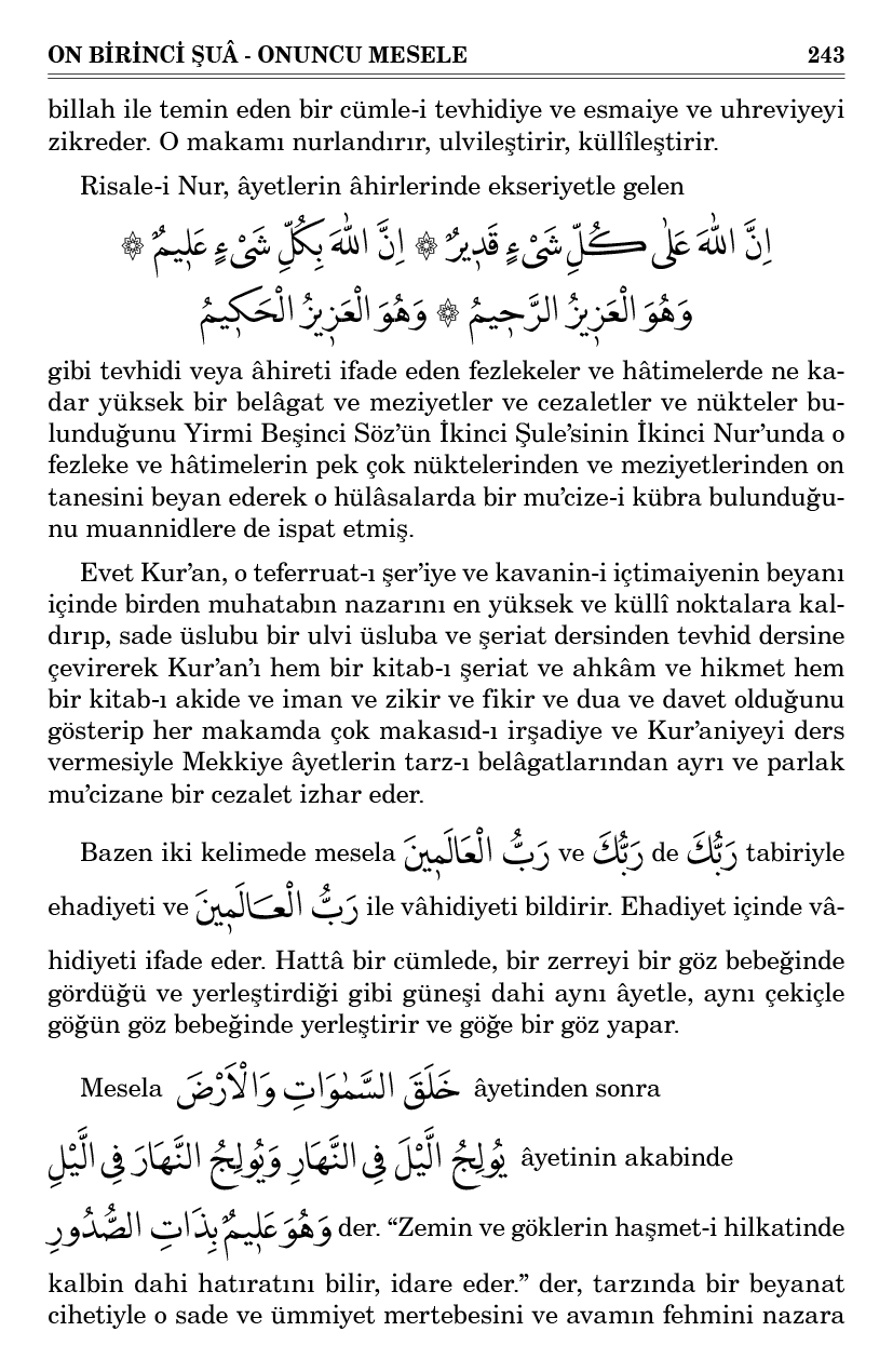 İşte –namaz tesbihatı gibi ibadetlerden bir kısmının tekrarı sünnet bulunan maddeler gibi– tekrarat-ı Kur’aniye bu gibi metin esaslara bakıyor. Hattâ bazen bir sahifede iktiza-yı makam ve ihtiyac-ı ifham ve belâgat-ı beyan cihetiyle yirmi defa sarîhan ve zımnen tevhid hakikatini ifade eder. Değil usanç, belki kuvvet ve şevk ve halâvet verir. Risale-i Nur’da, tekrarat-ı Kur’aniye ne kadar yerinde ve münasip ve belâgatça makbul olduğu hüccetleriyle beyan edilmiş.