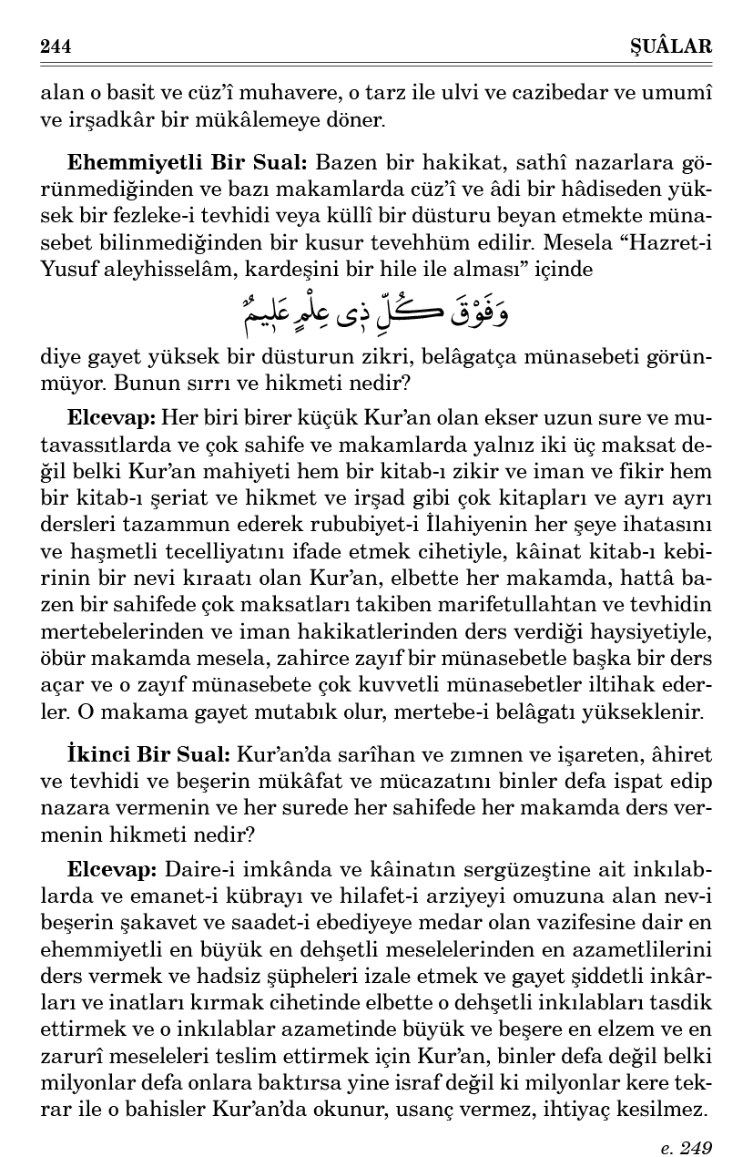 Ehemmiyetli Bir Sual: Bazen bir hakikat, sathî nazarlara görünmediğinden ve bazı makamlarda cüz’î ve âdi bir hâdiseden yüksek bir fezleke-i tevhidi veya küllî bir düsturu beyan etmekte münasebet bilinmediğinden bir kusur tevehhüm edilir. Mesela “Hazret-i Yusuf aleyhisselâm, kardeşini bir hile ile alması” içinde