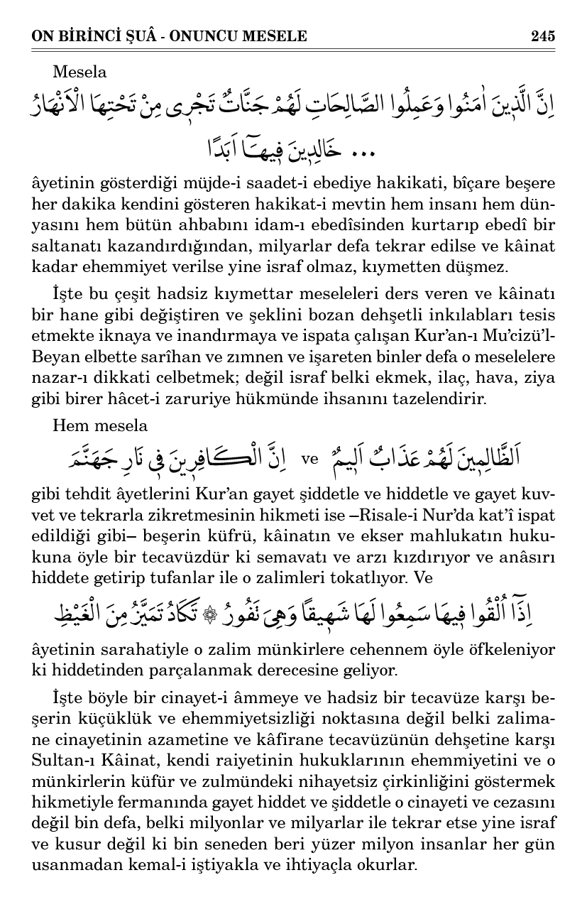 İkinci Bir Sual: Kur’an’da sarîhan ve zımnen ve işareten, âhiret ve tevhidi ve beşerin mükâfat ve mücazatını binler defa ispat edip nazara vermenin ve her surede her sahifede her makamda ders vermenin hikmeti nedir?