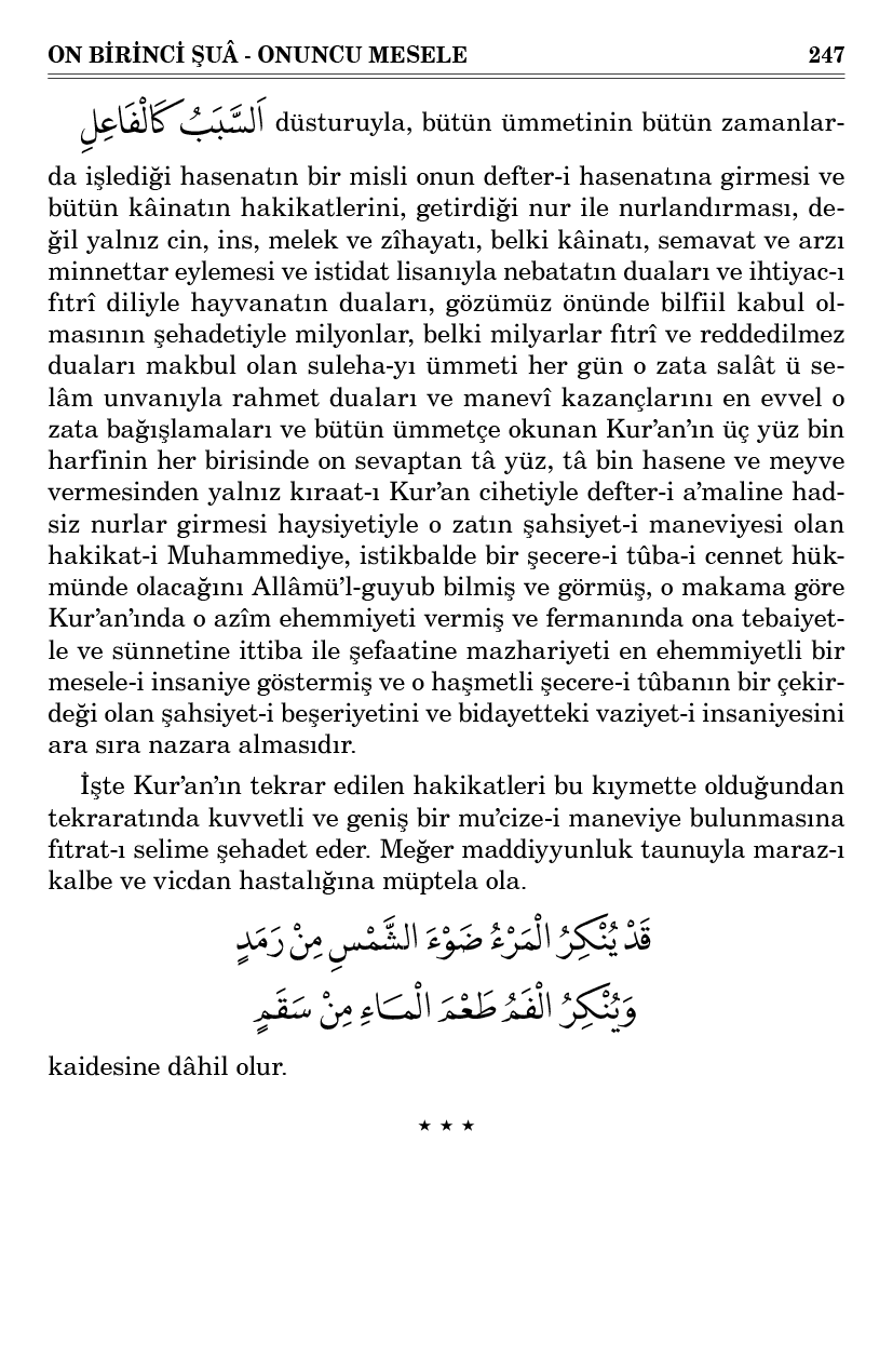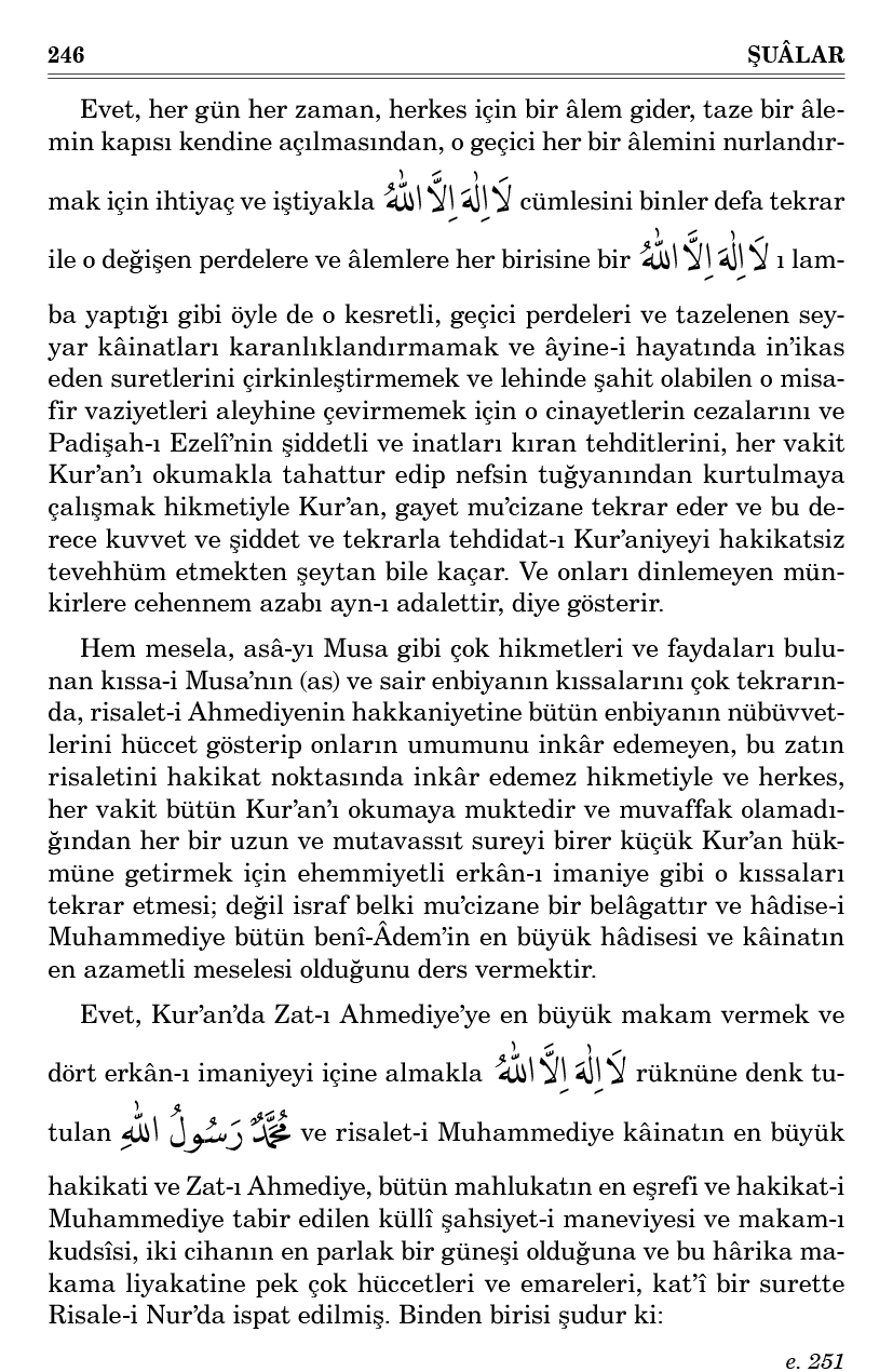 Evet, her gün her zaman, herkes için bir âlem gider, taze bir âlemin kapısı kendine açılmasından, o geçici her bir âlemini nurlandırmak için ihtiyaç ve iştiyakla لَا اِلٰهَ اِلَّا اللّٰهُ cümlesini binler defa tekrar ile o değişen perdelere ve âlemlere her birisine bir لَا اِلٰهَ اِلَّا اللّٰهُ ı lamba yaptığı gibi öyle de o kesretli, geçici perdeleri ve tazelenen seyyar kâinatları karanlıklandırmamak ve âyine-i hayatında in’ikas eden suretlerini çirkinleştirmemek ve lehinde şahit olabilen o misafir vaziyetleri aleyhine çevirmemek için o cinayetlerin cezalarını ve Padişah-ı Ezelî’nin şiddetli ve inatları kıran tehditlerini, her vakit Kur’an’ı okumakla tahattur edip nefsin tuğyanından kurtulmaya çalışmak hikmetiyle Kur’an, gayet mu’cizane tekrar eder ve bu derece kuvvet ve şiddet ve tekrarla tehdidat-ı Kur’aniyeyi hakikatsiz tevehhüm etmekten şeytan bile kaçar. Ve onları dinlemeyen münkirlere cehennem azabı ayn-ı adalettir, diye gösterir.