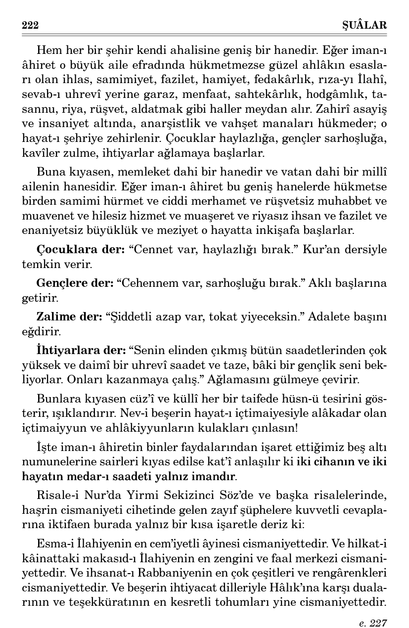 Hem her bir şehir kendi ahalisine geniş bir hanedir. Eğer iman-ı âhiret o büyük aile efradında hükmetmezse güzel ahlâkın esasları olan ihlas, samimiyet, fazilet, hamiyet, fedakârlık, rıza-yı İlahî, sevab-ı uhrevî yerine garaz, menfaat, sahtekârlık, hodgâmlık, tasannu, riya, rüşvet, aldatmak gibi haller meydan alır. Zahirî asayiş ve insaniyet altında, anarşistlik ve vahşet manaları hükmeder; o hayat-ı şehriye zehirlenir. Çocuklar haylazlığa, gençler sarhoşluğa, kavîler zulme, ihtiyarlar ağlamaya başlarlar.