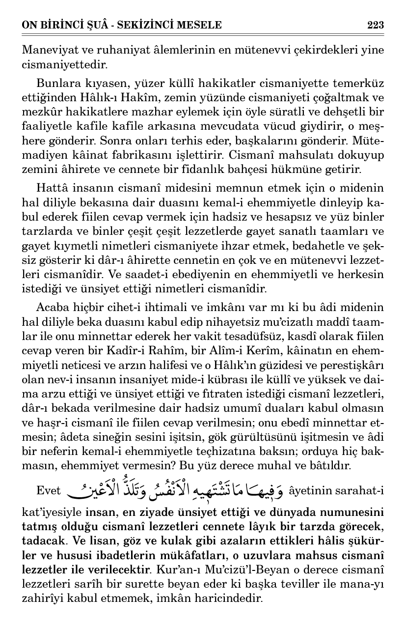 Esma-i İlahiyenin en cem’iyetli âyinesi cismaniyettedir. Ve hilkat-i kâinattaki makasıd-ı İlahiyenin en zengini ve faal merkezi cismaniyettedir. Ve ihsanat-ı Rabbaniyenin en çok çeşitleri ve rengârenkleri cismaniyettedir. Ve beşerin ihtiyacat dilleriyle Hâlık’ına karşı dualarının ve teşekküratının en kesretli tohumları yine cismaniyettedir.
