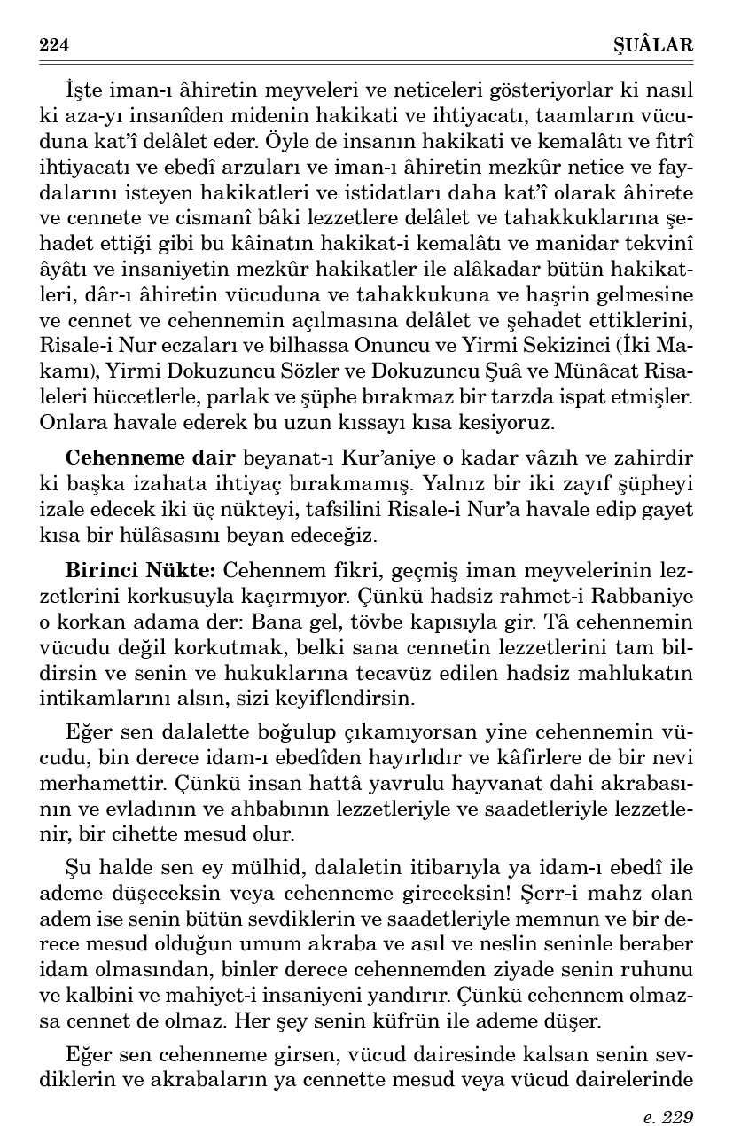 Eğer sen dalalette boğulup çıkamıyorsan yine cehennemin vücudu, bin derece idam-ı ebedîden hayırlıdır ve kâfirlere de bir nevi merhamettir. Çünkü insan hattâ yavrulu hayvanat dahi akrabasının ve evladının ve ahbabının lezzetleriyle ve saadetleriyle lezzetlenir, bir cihette mesud olur.