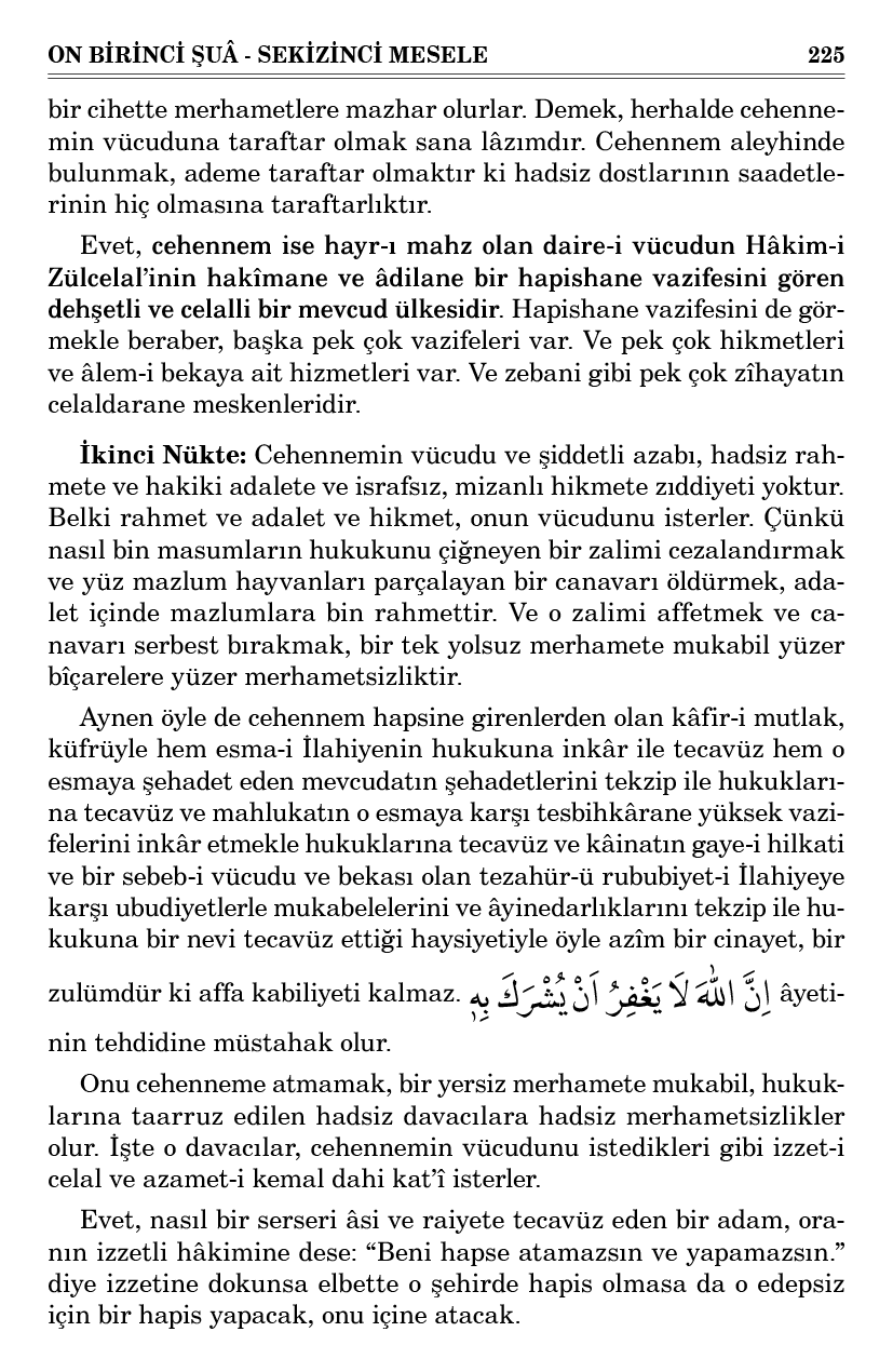 Cehenneme dair beyanat-ı Kur’aniye o kadar vâzıh ve zahirdir ki başka izahata ihtiyaç bırakmamış. Yalnız bir iki zayıf şüpheyi izale edecek iki üç nükteyi, tafsilini Risale-i Nur’a havale edip gayet kısa bir hülâsasını beyan edeceğiz.