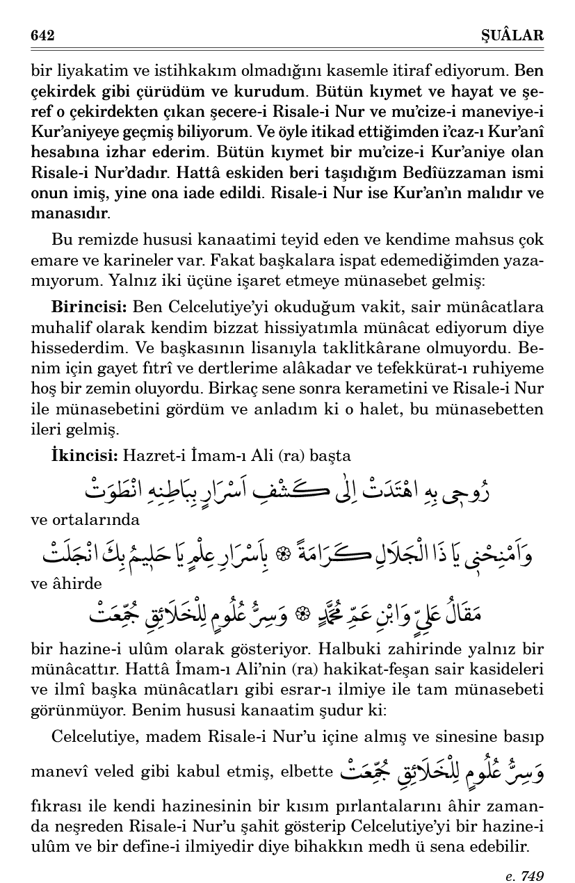 Birincisi: Ben Celcelutiye’yi okuduğum vakit, sair münâcatlara muhalif olarak kendim bizzat hissiyatımla münâcat ediyorum diye hissederdim. Ve başkasının lisanıyla taklitkârane olmuyordu. Benim için gayet fıtrî ve dertlerime alâkadar ve tefekkürat-ı ruhiyeme hoş bir zemin oluyordu. Birkaç sene sonra kerametini ve Risale-i Nur ile münasebetini gördüm ve anladım ki o halet, bu münasebetten ileri gelmiş.