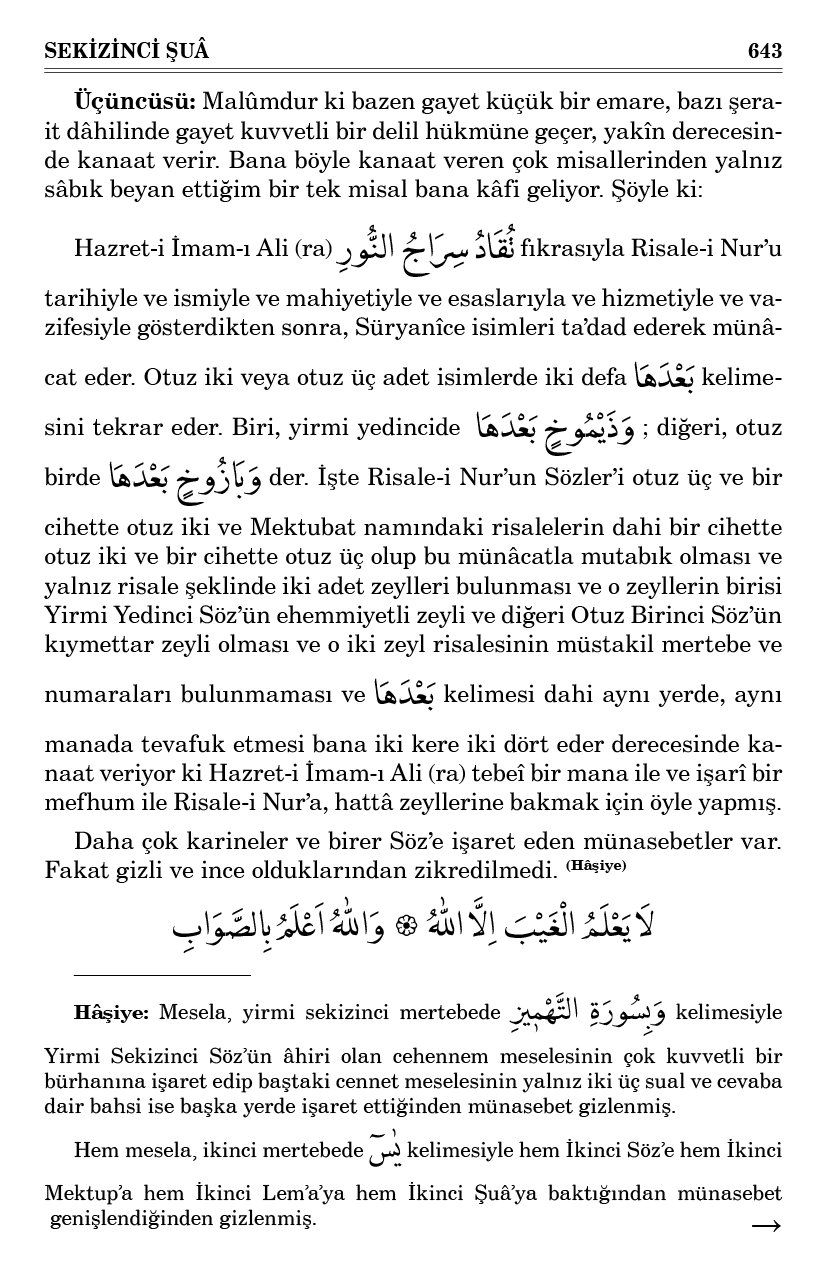 bir hazine-i ulûm olarak gösteriyor. Halbuki zahirinde yalnız bir münâcattır. Hattâ İmam-ı Ali’nin (ra) hakikat-feşan sair kasideleri ve ilmî başka münâcatları gibi esrar-ı ilmiye ile tam münasebeti görünmüyor. Benim hususi kanaatim şudur ki: