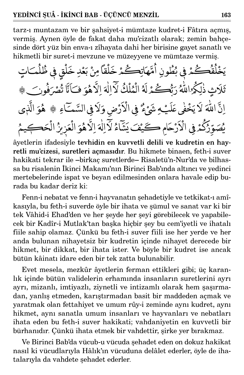 Evet mesela, mezkûr âyetlerin ferman ettikleri gibi; üç karanlık içinde bütün validelerin erhamında insanların suretlerini ayrı ayrı, mizanlı, imtiyazlı, ziynetli ve intizamlı olarak hem şaşırmadan, yanlış etmeden, karıştırmadan basit bir maddeden açmak ve yaratmak olan fettahiyet ve umum rûy-i zeminde aynı kudret, aynı hikmet, aynı sanatla umum insanları ve hayvanları ve nebatları ihata eden bu feth-i suver hakikati; vahdaniyetin en kuvvetli bir bürhanıdır. Çünkü ihata etmek bir vahdettir, şirke yer bırakmaz.