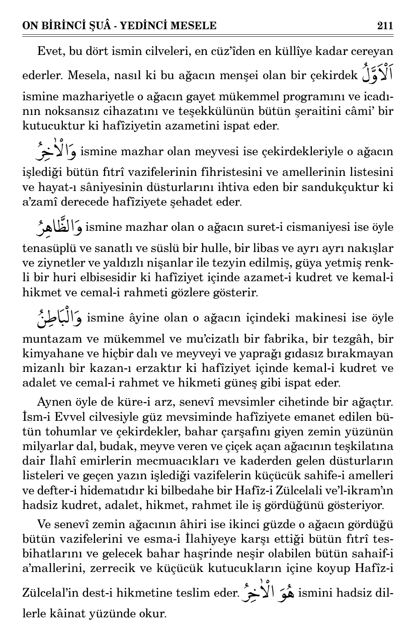 Evet, her baharda müşahede ediyoruz ki güz mevsimi kıyametinde vefat eden hadsiz nebatat, bahar haşrinde her bir ağaç her bir kök her bir çekirdek her bir tohum وَاِذَا الصُّحُفُ نُشِرَتْ âyetini okuyup bir manasını, bir ferdini kendi diliyle geçmiş senelerde gördüğü vazifenin misalleriyle tefsir ederek o azametli hafîziyete şehadet eder. هُوَ الْاَوَّلُ وَالْاٰخِرُ وَالظَّاهِرُ وَالْبَاطِنُ âyetindeki dört muazzam hakikatleri her şeyde gösterip hafîziyeti a’zamî derecede ve haşri bahar kolaylığında ve kat’iyetinde bizlere ders verir.