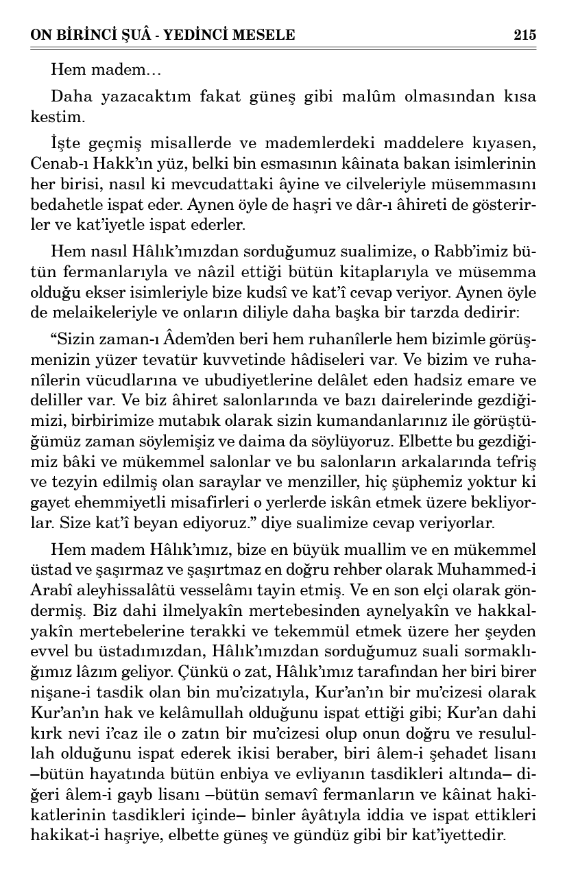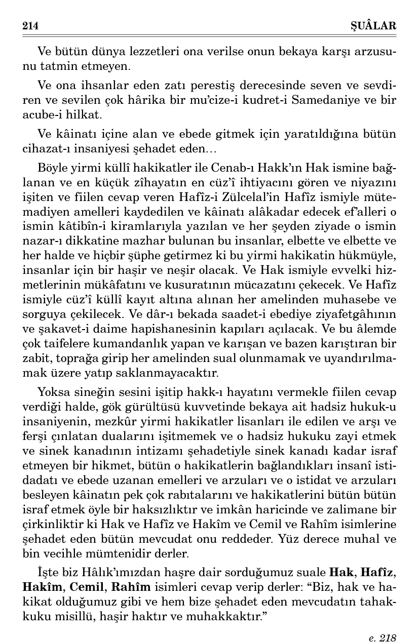 Böyle yirmi küllî hakikatler ile Cenab-ı Hakk’ın Hak ismine bağlanan ve en küçük zîhayatın en cüz’î ihtiyacını gören ve niyazını işiten ve fiilen cevap veren Hafîz-i Zülcelal’in Hafîz ismiyle mütemadiyen amelleri kaydedilen ve kâinatı alâkadar edecek ef’alleri o ismin kâtibîn-i kiramlarıyla yazılan ve her şeyden ziyade o ismin nazar-ı dikkatine mazhar bulunan bu insanlar, elbette ve elbette ve her halde ve hiçbir şüphe getirmez ki bu yirmi hakikatin hükmüyle, insanlar için bir haşir ve neşir olacak. Ve Hak ismiyle evvelki hizmetlerinin mükâfatını ve kusuratının mücazatını çekecek. Ve Hafîz ismiyle cüz’î küllî kayıt altına alınan her amelinden muhasebe ve sorguya çekilecek. Ve dâr-ı bekada saadet-i ebediye ziyafetgâhının ve şakavet-i daime hapishanesinin kapıları açılacak. Ve bu âlemde çok taifelere kumandanlık yapan ve karışan ve bazen karıştıran bir zabit, toprağa girip her amelinden sual olunmamak ve uyandırılmamak üzere yatıp saklanmayacaktır.