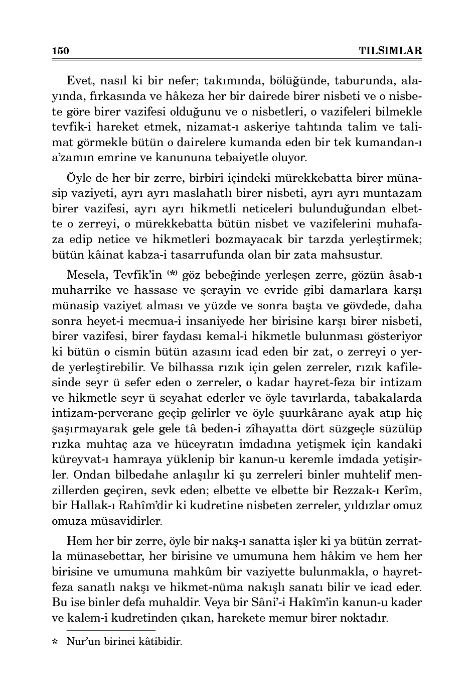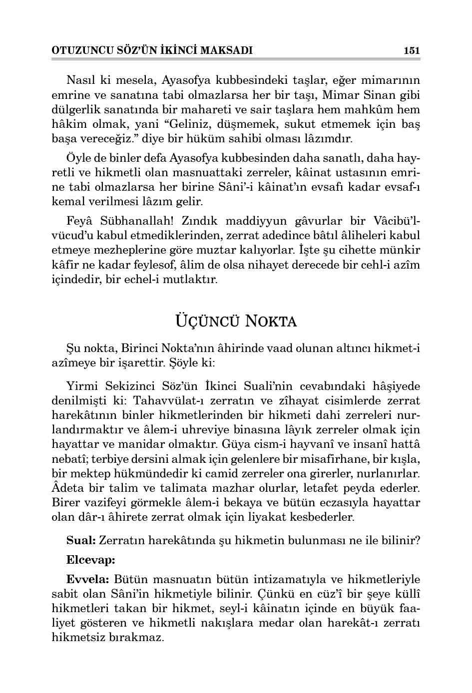 Öyle de binler defa Ayasofya kubbesinden daha sanatlı, daha hayretli ve hikmetli olan masnuattaki zerreler, kâinat ustasının emrine tabi olmazlarsa her birine Sâni’-i kâinat’ın evsafı kadar evsaf-ı kemal verilmesi lâzım gelir.