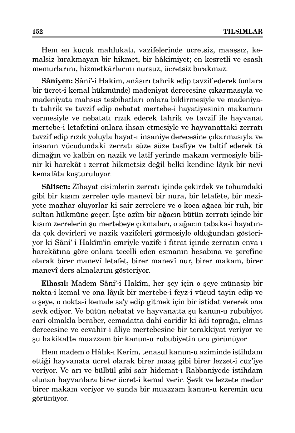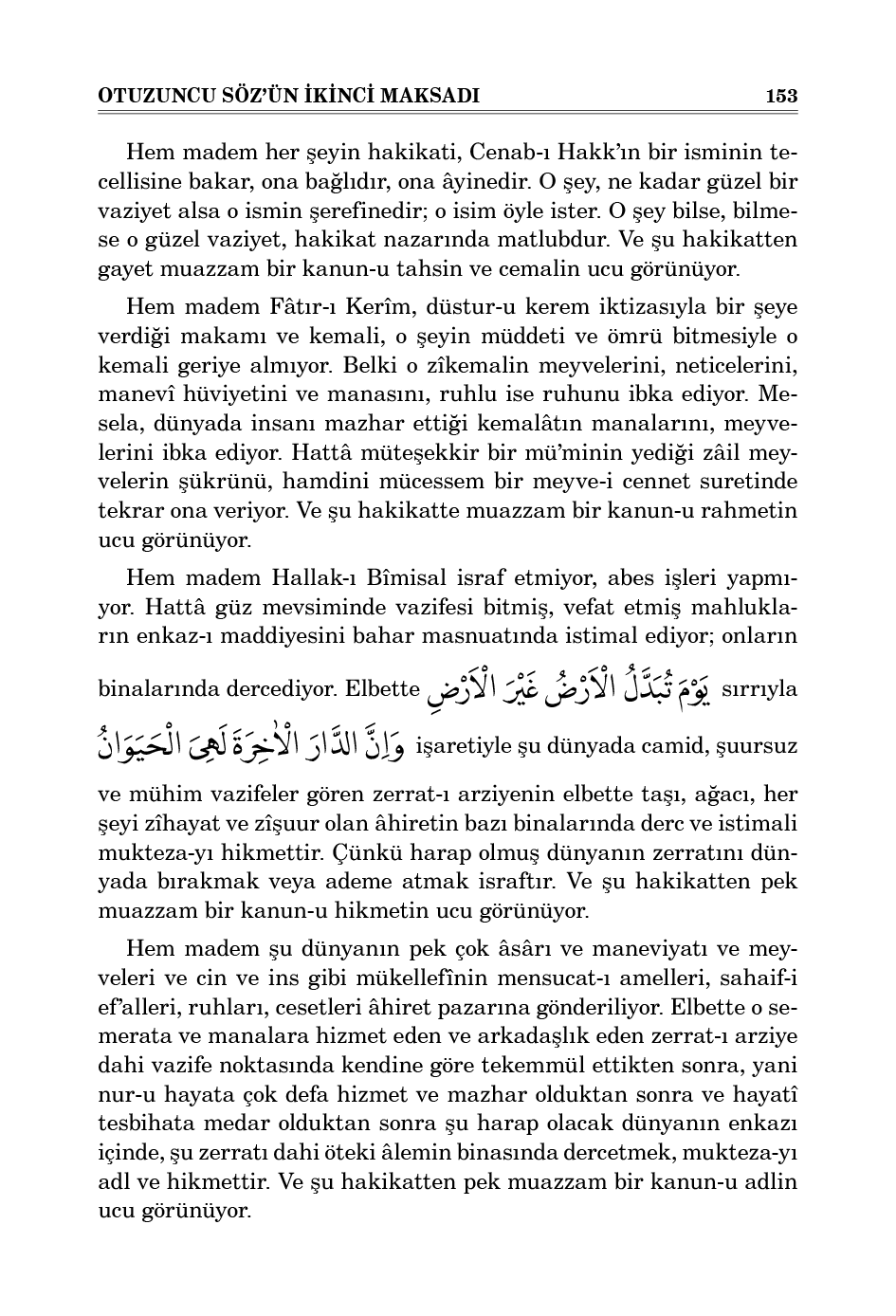 Sâlisen: Zîhayat cisimlerin zerratı içinde çekirdek ve tohumdaki gibi bir kısım zerreler öyle manevî bir nura, bir letafete, bir meziyete mazhar oluyorlar ki sair zerrelere ve o koca ağaca bir ruh, bir sultan hükmüne geçer. İşte azîm bir ağacın bütün zerratı içinde bir kısım zerrelerin şu mertebeye çıkmaları, o ağacın tabaka-i hayatında çok devirleri ve nazik vazifeleri görmesiyle olduğundan gösteriyor ki Sâni’-i Hakîm’in emriyle vazife-i fıtrat içinde zerratın enva-ı harekâtına göre onlara tecelli eden esmanın hesabına ve şerefine olarak birer manevî letafet, birer manevî nur, birer makam, birer manevî ders almalarını gösteriyor.